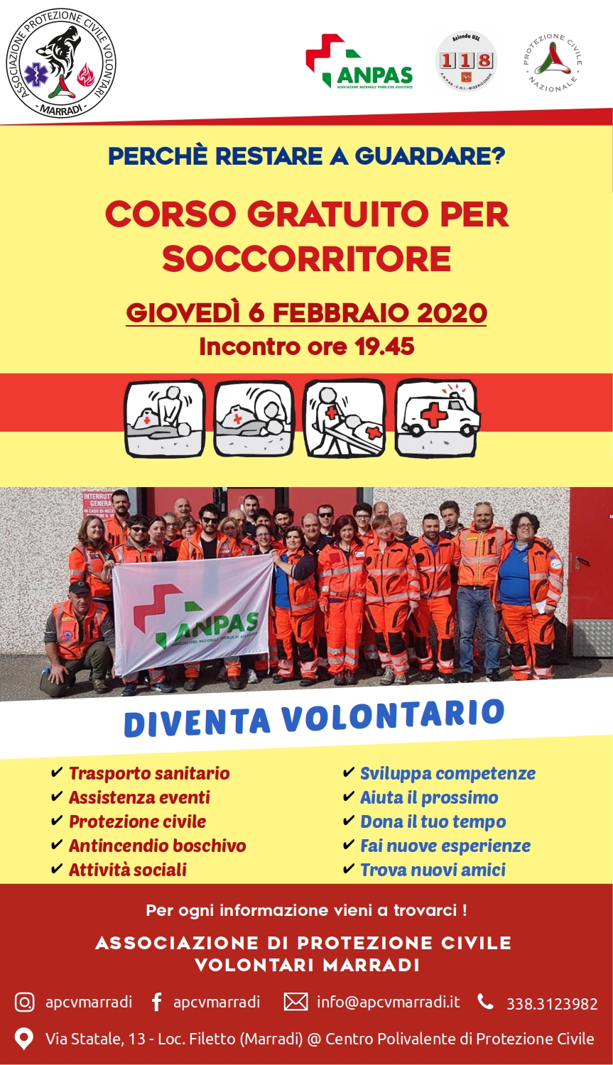 L’Associazione di Protezione Civile Volontari Marradi propone un corso abilitante alla qualifica di soccorritore totalmente gratuito che si svolgerà su più lezioni tenute dai nostri formatori.